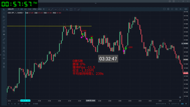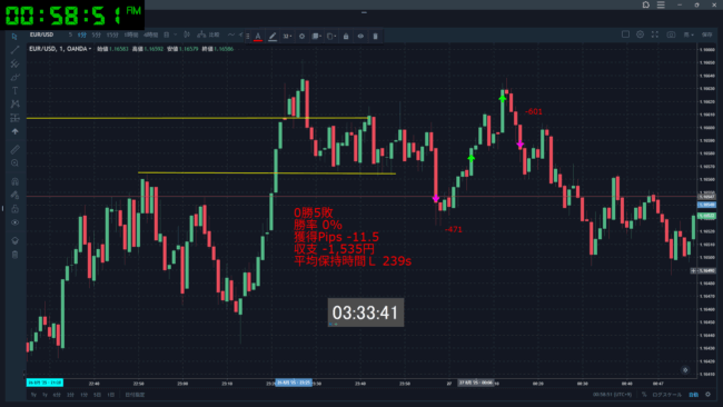 全てマイナスだったが、ほとんどトレードではエントリー後に2pipsほど順行して含み益となっていた。僕のトレードは含み益を伸ばすスタイルなので微益で決済はしない。この日はこのスタイルが仇となり、逆行してきて全て損切りとなった。