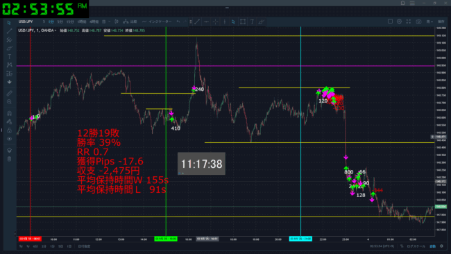 秒スキャをしてしまい、わずか25分間で15回のトレードをして15連敗。この間だけで、勝率0%の-¥2,630を記録した。チャートの形的にも「148.800を超えて行くだろう」と期待し、手前で買いまくってしまった。