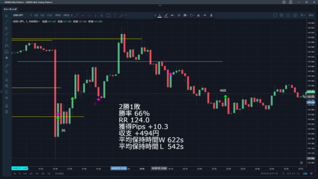 だとすれば指標発表直後にエントリーするのは理屈に合わない。本気の押し目買いが入るのであればそれなりの時間は要するはず。この日のトレードであれば21:30に指標発表があり、21:31の1分後にトレードしている。1分後に本気の押し目買い(この日は逆で「本気の戻り売り」)を崩すのはあまりに早すぎると思った。
