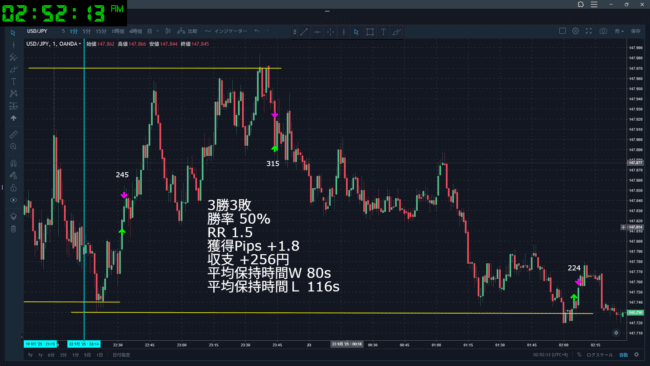 この日は25:35と26:00に大きな指標があり、翌日が祝日なのも相まって、鼻息フンフンでその時間を迎えた。たまたま25:20くらいに節目を超えたのもあり、私のエントリー条件を満たしていた。