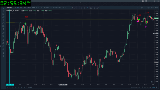ただ、25:35を迎えても大きな値動きはなく「え?本当に重要指標あったの?」と疑問に思ったが、ジワジワとゆっくり私のエントリー条件を満たした場面でエントリーした。それも3回ほど。