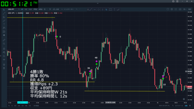 この日は「止まったら決済する」を徹底していた。エントリー直後でも、利が乗った時でも、価格が「止まった」と思えたら決済を徹底したところ、高勝率で終える事ができた。