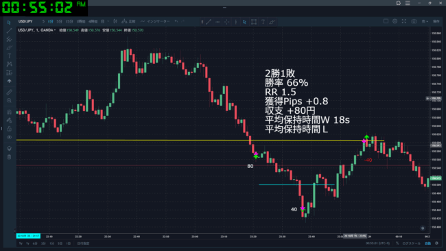 この日は2連勝後の1敗で微益となった。2連勝は想定通りの動きが出てエントリーしたトレード。続く1敗は、2連勝から調子に乗ったのと「何か取れそう」的な欲にまみれたトレードだった。そしてやはり良くまみれのトレードで負けた。