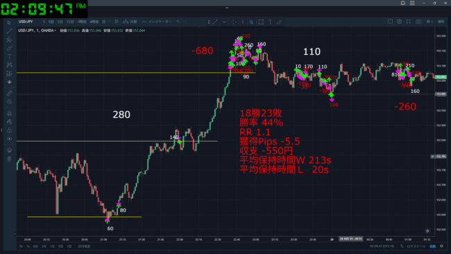 この日はNY開幕から3連勝で+2.8pipsと順調すぎる滑り出しだった。15分足で引ける節目ラインまで待って、節目超えの期待値ある動きをトレードできた。週末に検証した「やらなくて良いトレードをしなければ勝てる」を実践しようと忠実にルールを守る事ができた。