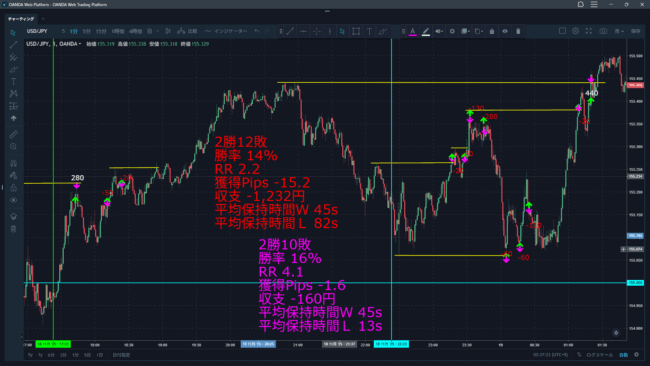 この日の秒スキャの成績は、2勝10敗、RR 4.1、-¥160と負けたが、感触はとてもよ良かった。