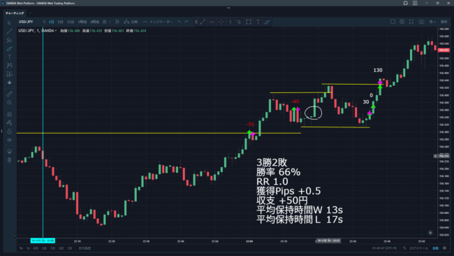 5回トレードして3勝2敗。もっと早く損切りできたり、もっと伸ばせるトレードもあったと感じる部分はあるものの、無駄なトレードをせず、しっかりとルールを守れて勝てた。
