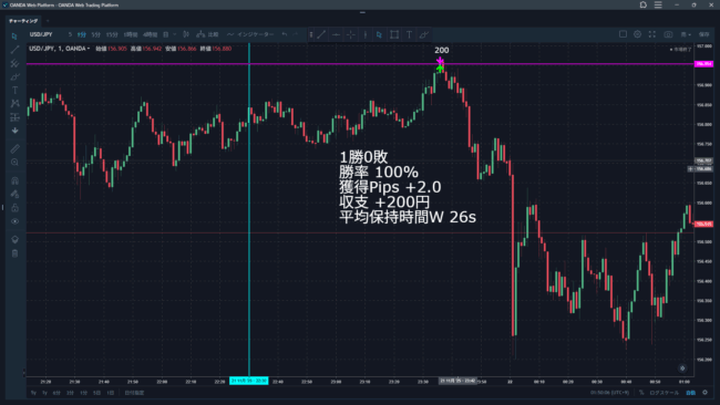 一方で「伸びない」の判断をいつ下すか?に課題を抱えている。この日のトレードも26秒保持していて、最後の5秒ほどで伸びてから決済した。つまり20秒くらいは0.1-0.3くらいの微々たる含み益で上下していた。