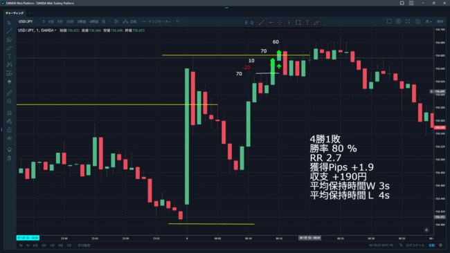 節目超えだけを狙う意識でトレードしたこの日。チャンスとなる場面は、24:00の指標の高値を超えていく1場面だけでした。