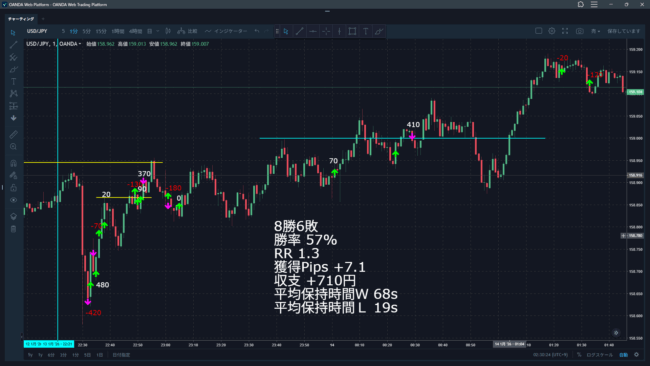 この日も+3.7、+4.1と大きな勝ちが2回あった。それも利益を伸ばしやすい安値割りで入れたからだと感じる。