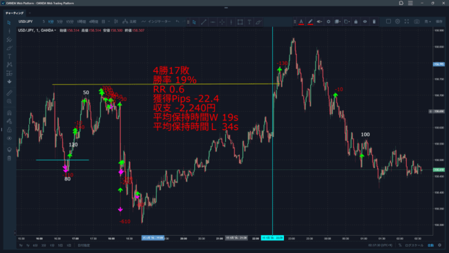ロスカットをもらえたら利確。ロスカットが出なかったら = モジモジした動きなら損切り。となるので、決済理由も明確となることに気づいた。