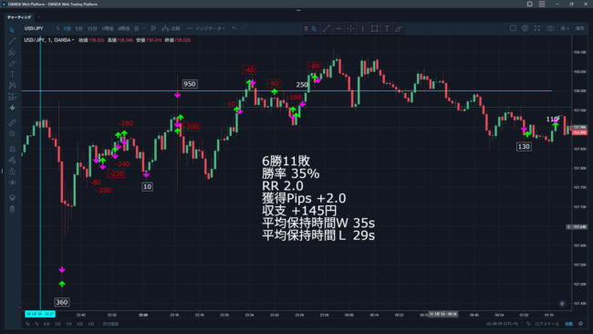 どうやら要人発言ぽいのだが、NY時間で2回大きく上下する時があった。その2回で+3.5、+9.5、-2.0と大きく勝ち越せた。しかしそれ以外のトレードでは大して動かないヨコヨコのレンジで負けまくった。