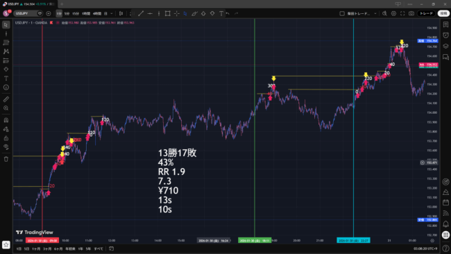 昨日に続き、今日も勝てた事が何より嬉しい。この日は朝からトレードできたので、トレード回数多めだが、昨日はトレード回数2回で全てブレイク狙いで勝てた。この日は24回がブレイク狙いで12勝12敗で利益も10 pipsほどあったと思う。