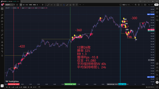 という罪を犯し、握り潰す負けトレードも増えてしまった。コツコツと負けを増やしていき、NY時間では指標キッカケで大きく動いた流れに