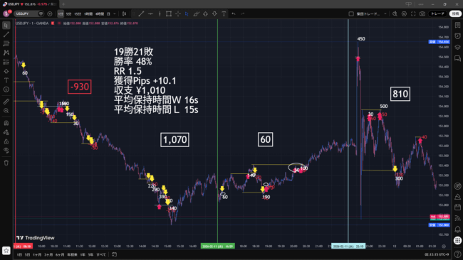 その後、もう一度154.000を下抜ける動きが出て、もう一度売りエントリーするも、またもし逆行し耐えてしまい、-3.1 pipsで耐えきれず損切り。同じ過ちを高速で2回も繰り返してしまい、この日のトレードを難しくしてしまった。