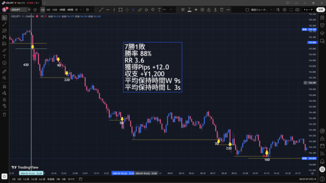 HOME > 毎日のトレード > 毎日のトレード 2026/02/10 トレード 2026年2月11日 2026年2月14日 7勝1敗勝率 88%RR 3.6獲得pips +12.0収支 +¥1,200平均保持時間W 9秒平均保持時間L 3秒 不要なトレードした率 12.5%(1/8) 日次の成績で言えば、スキャルピングを始めて最も良い1日となった。その要因となるのが「不要なトレードをした率」の低さだと思う。裏を返せば7/8回ば自分が思うトレードができたという事だ。 この成績と要因を糧に、「自分のトレード」だけを出来るようにしていきたい Post Share Hatena LINE note URLコピー この記事を書いた人 最新記事 FXのプロになる柴田 FXのプロになる事を決めました!目標はまず1億円を稼ぐ事です。億トレーダーになるまでの道のりをここに綴ります。必ず、FXのプロになります!! 2026/02/132026/02/12 トレード 2026/02/122026/02/11 トレード 2026/02/112026/02/10 トレード FXのプロになる柴田の記事をもっと見る -毎日のトレード