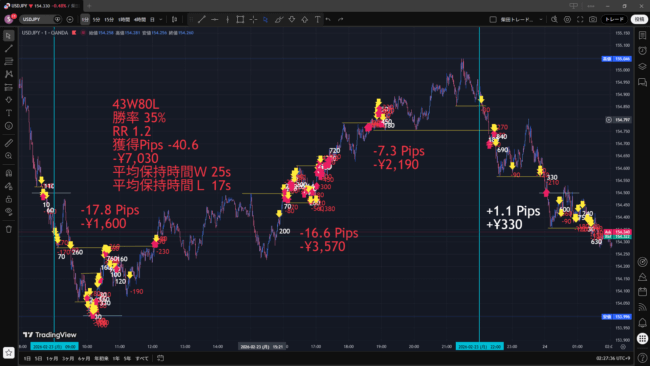 ルール通りのトレードではあったが、9時台に負ったこの5回の負けだけで-8.7 pipsとなり、これを取り戻そうと10時台には28回もトレードしていた。そして最終的には東京時間で-17.6 pipsと負債を広げた