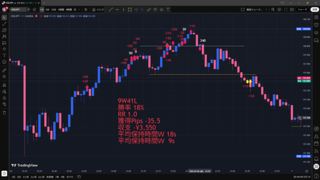 NYの反省点は、158.000付近。下からタッチしたところを逆張りし、貫かれて負け。じゃあ上か?とドテン買いするも下げてきて負け。その後はしつこく高値超えを買っていくも、上には伸びずに全て損切りとなった。158.000を超えて上に行くはず!と、思い込み過ぎた負け方だった。反省!