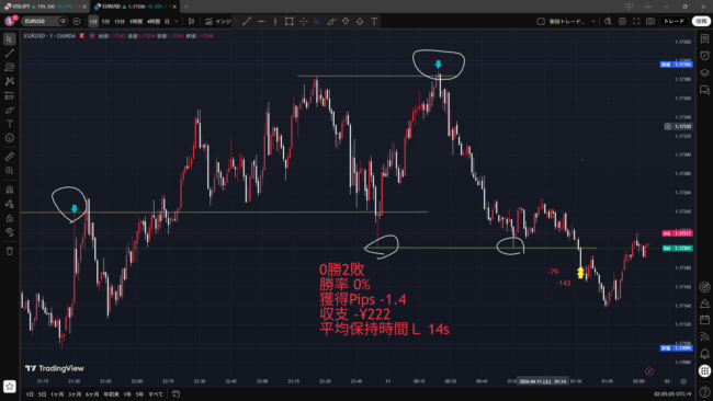 1回目のトレードは上記の通りの動きがでて逆張りした。残念ならがらリバウンドの上昇が起こることはなく、更に下げたところでロスカットした。
