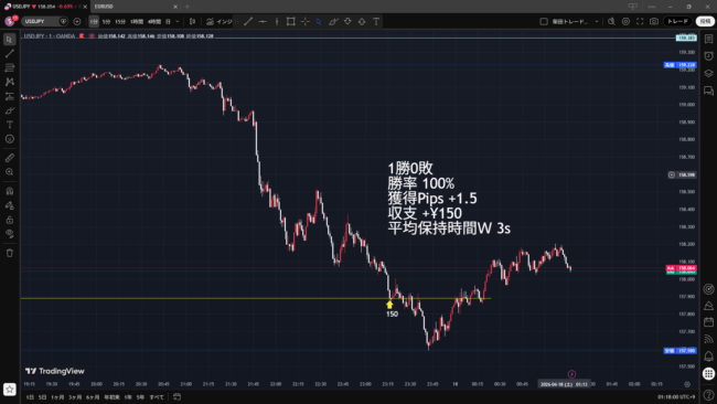 4月から節目超えの逆張りをし始めて、1トレードで最大の勝ちとなった。勢い良く下げてきて、そのまま節目を割った後に更にグッと下げたところで迷いなくエントリーした。そして思い通りのリバウンドが生まれて3秒で利確。会心のトレードができたと感じている。